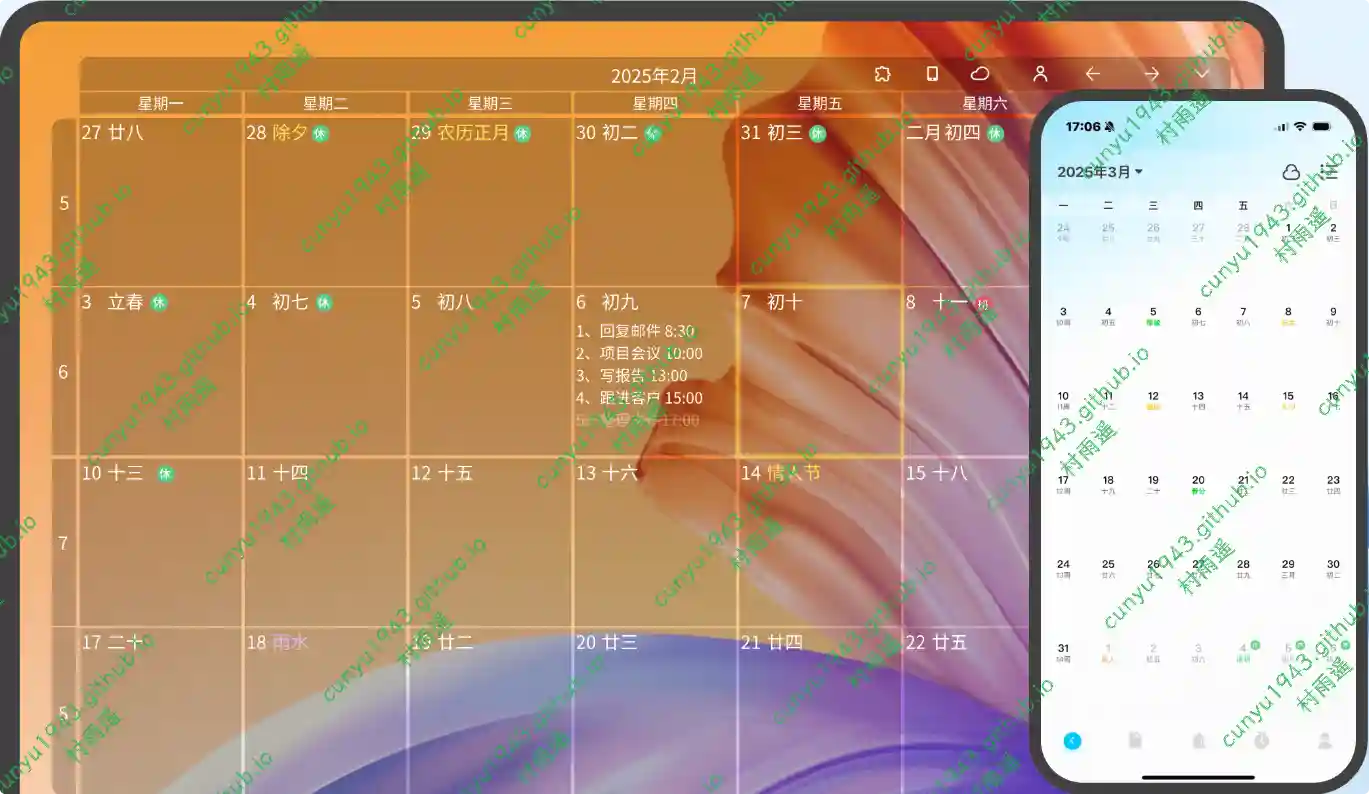 可以透明的显示在桌面壁纸上,提供农历、节气、节假日、法定假日显示。 双击即可编辑记录琐事、日程安排、重复任务等,还可以微信提醒。支持多端同步数据,实时共享数据,团队协作。