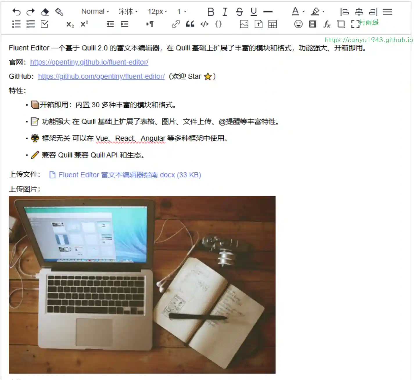 一个基于 Quill 2.0 的富文本编辑器,在 Quill 基础上扩展了表格、图片、超链接、复制粘贴、插入表情、文件上传、@提醒、斜杆菜单等丰富的模块和格式,框架无关、兼容 Quill API、兼容 Quill 模块生态。