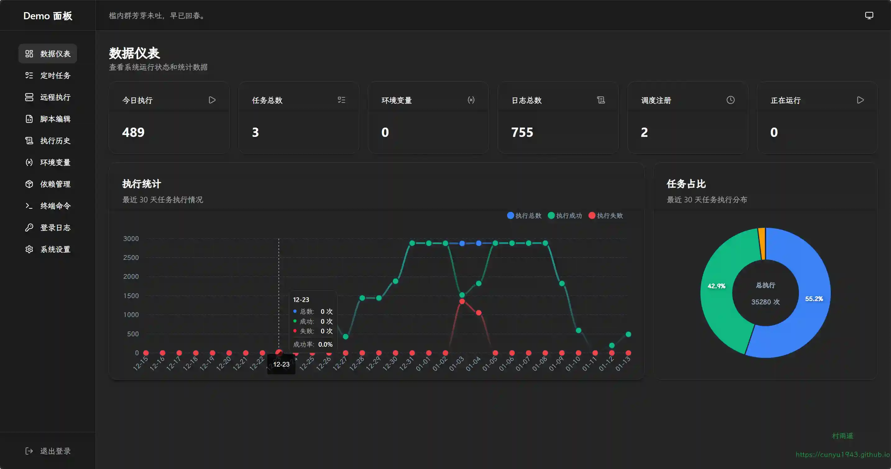 一个轻量级定时任务管理系统,基于Go +Vue3 构建,docker或者docker-compose,内置python3、nodejs、bash环境,开箱即用。