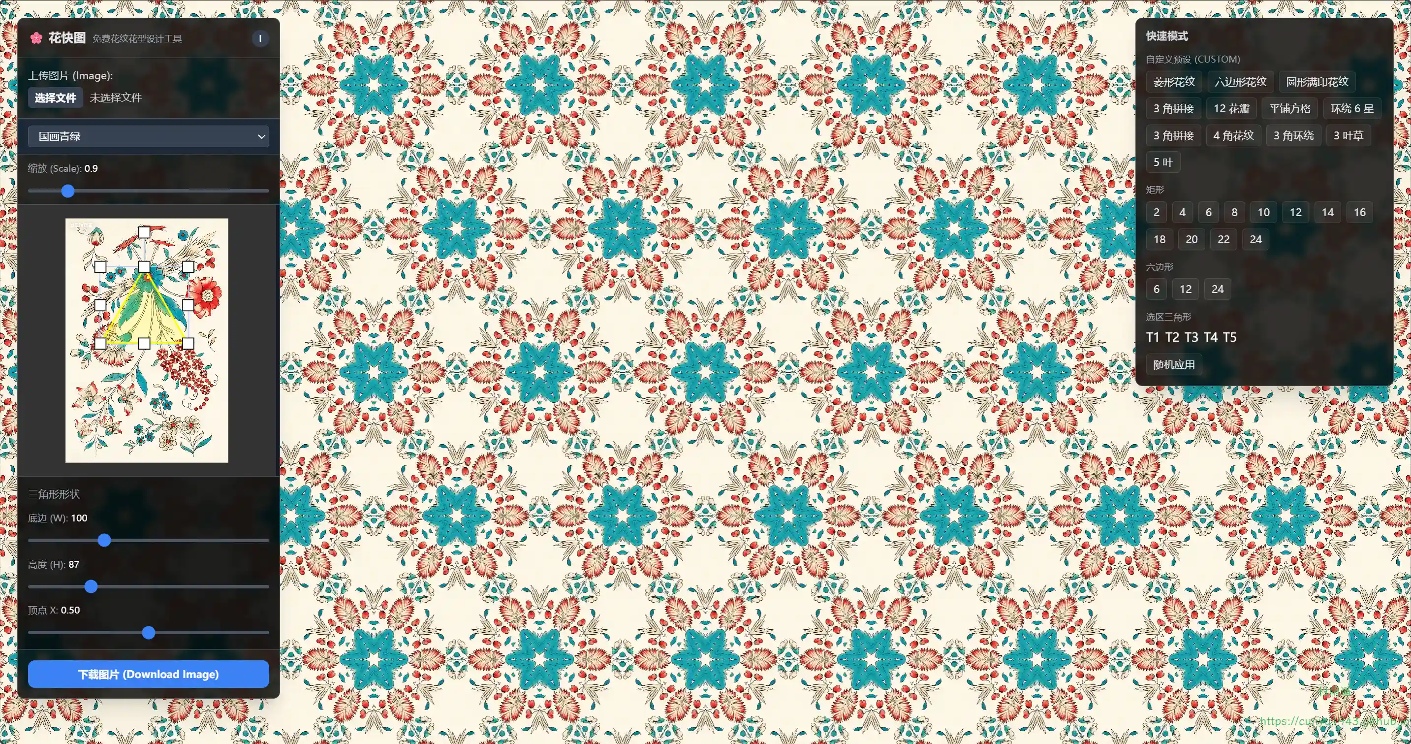 提供免费在线花型设计服务,支持快速生成四方连续纹样与万花筒图案,适用于纺织印花、面料设计与 3D 效果预览,无需下载软件即可完成设计。