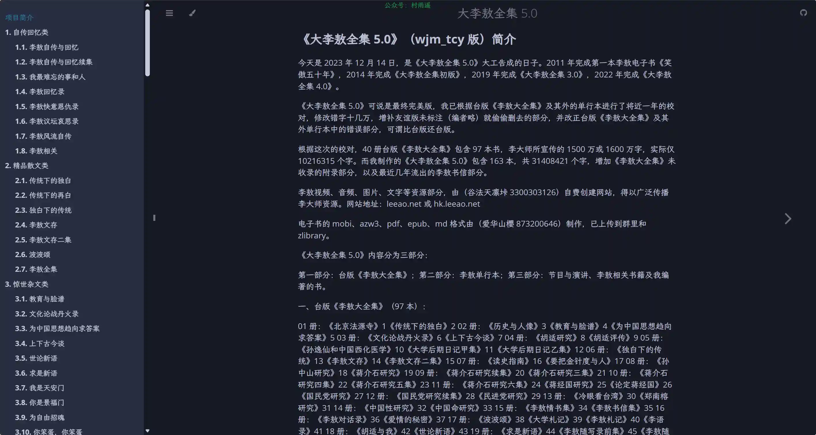 《大李敖全集 5.0》专属展示与传播站点,该版本由 wjm_tcy 耗时近一年校对完成并于2023 年 12 月 14 日 定稿,是在台版《李敖大全集》基础上的最终完美版,修复错字十几万、增补删减内容。