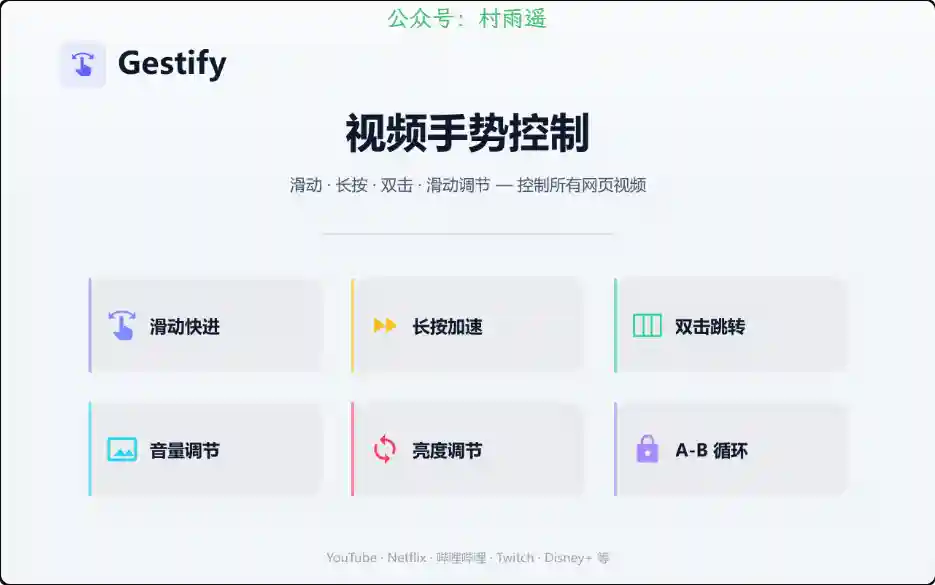 手势控制网页视频,滑动快进快退,长按倍速播放,上下滑调节音量与亮度。支持 A-B 循环、缩略图预览等高级功能。