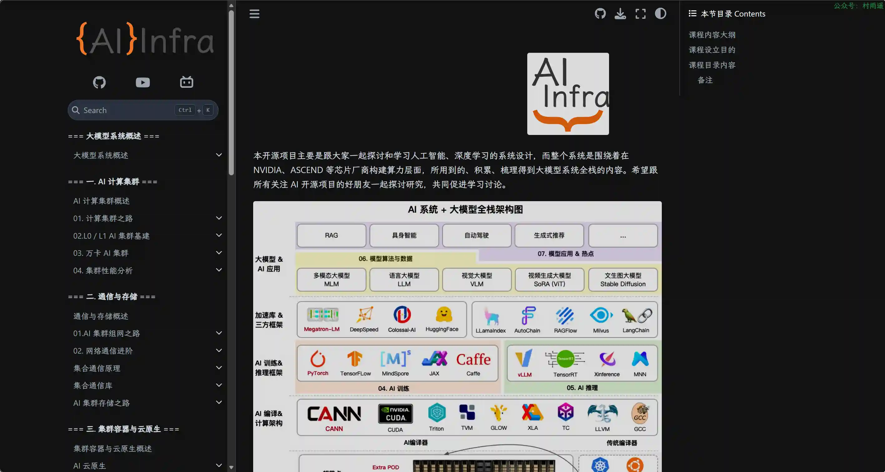跟大家一起探讨和学习人工智能、深度学习的系统设计,而整个系统是围绕着在 NVIDIA、ASCEND 等芯片厂商构建算力层面,所用到的、积累、梳理得到大模型系统全栈的内容。